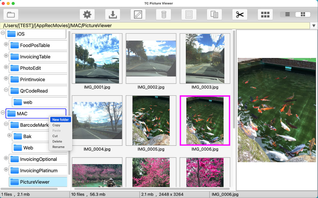 - File browsing: picture list 1.Support image types: PNG, JPEG, JPG, JPEG2000 (JP2), GIF, BMP, TIFF. 2.The list display of Information or Thumbnail can be switched. 3.You can customize the size of the thumbnails and the number of each row. 4.Files can be selected, and most can be selected by dragging with the mouse, or by pressing Command+click on files or thumbnails to make multiple selections. 5.After selection, functions such as [Cut], [Copy], [Paste], and [Delete] can be executed. 6.File rename: In the information mode, click the file, click the file name again, and wait one second to change the name. 7.File rename: In thumbnail mode, click the thumbnail, right-click the mouse, and select [Rename]. 8.Click the file or thumbnail twice in succession or click the preview image on the right to open the picture viewing window. 9.Support free adjustment of the width of [Folder], [Picture List] and [Preview Window]. 10.Folder path history record function. You can quickly open folders based on historical records. 11.Folder path collection function. Commonly used folder paths can be added to the favorite list to quickly open the folder.
