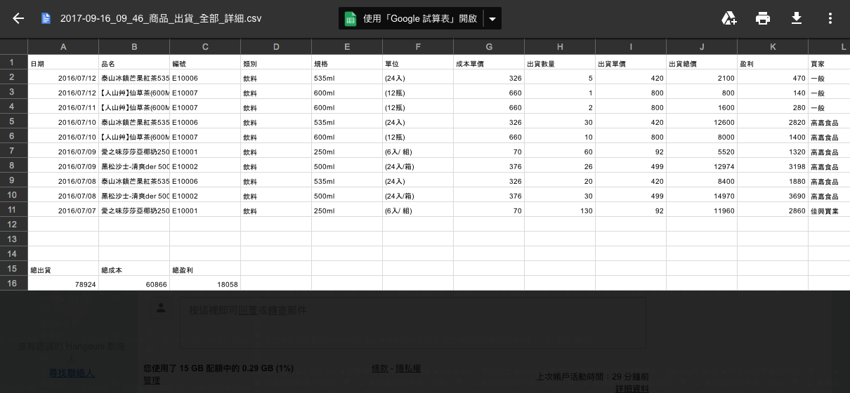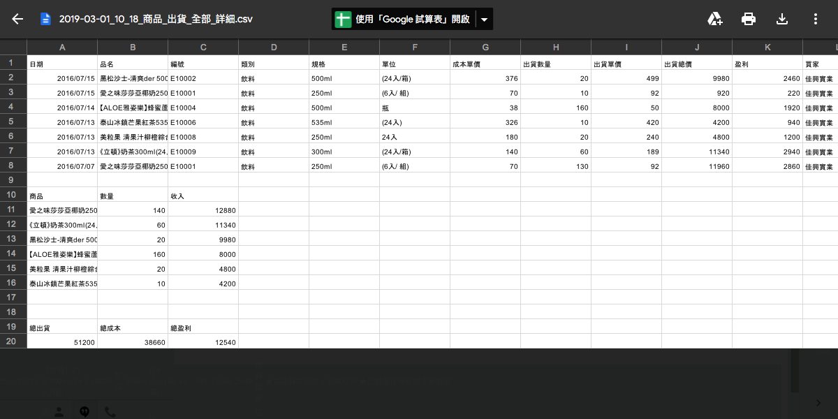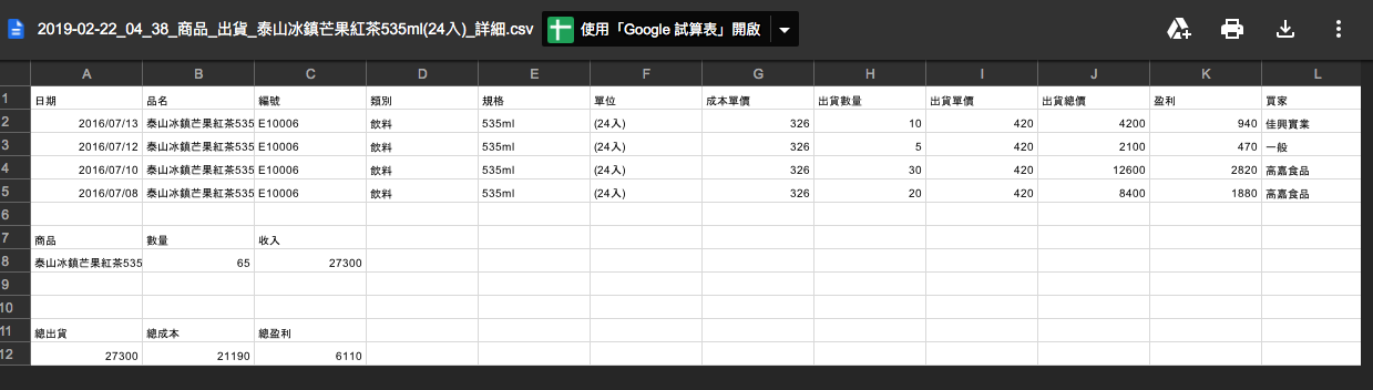 下方為輸出的出貨詳細CSV檔快照(所選日期範圍),裡邊有各筆出貨的詳細與利潤,最後加總成總出貨金額與總利潤。輸出的功能在商品統計裡(VIP),(商品統計>選日期>選出貨>輸出>詳細格式)。